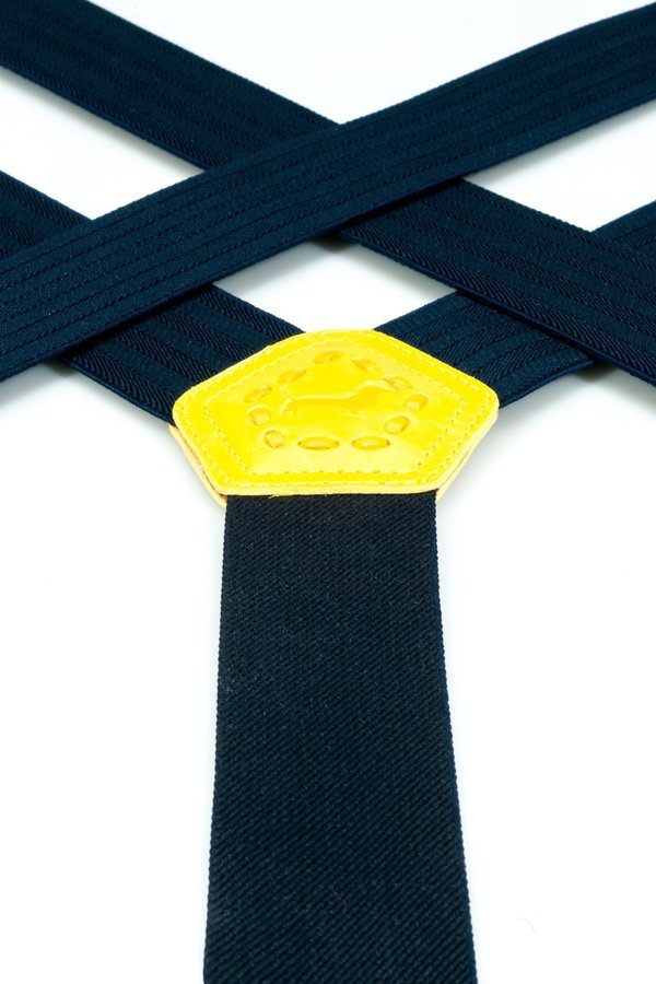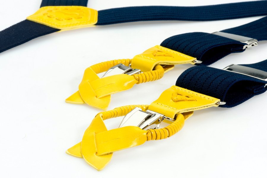 Blaue Hosenträger aus Kanevas mit gelbem Leder